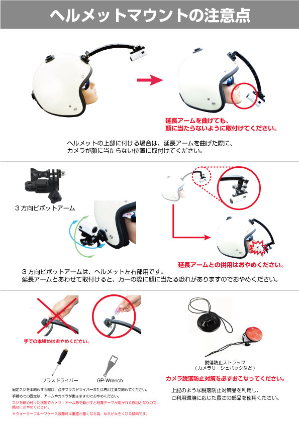ネジを締め付けた状態でカメラ・アーム等を動かすと粘着テープが剥がれる原因となります。絶対におやめください。