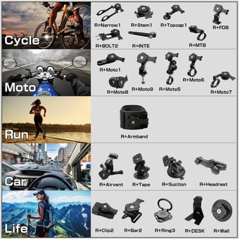 自転車用・オートバイ用・ランニング用・自動車用・日常生活用で多くのマウントをラインナップ。一つのケース・アダプターでマウントが共通で利用可能なのでシーンごとにいちいちケースを付け替える必要はありません。